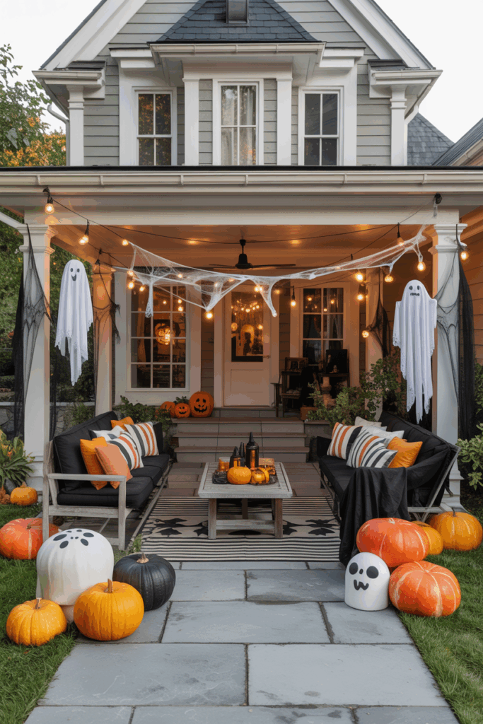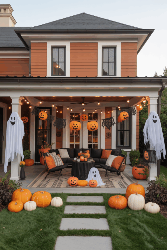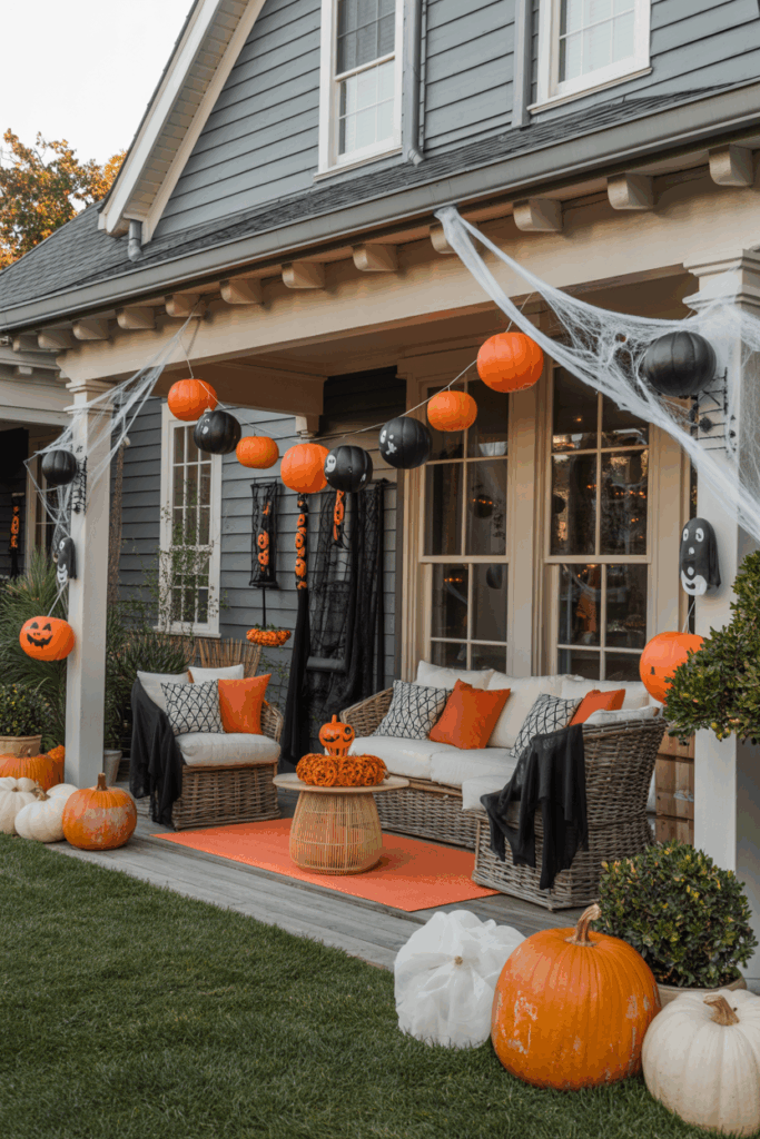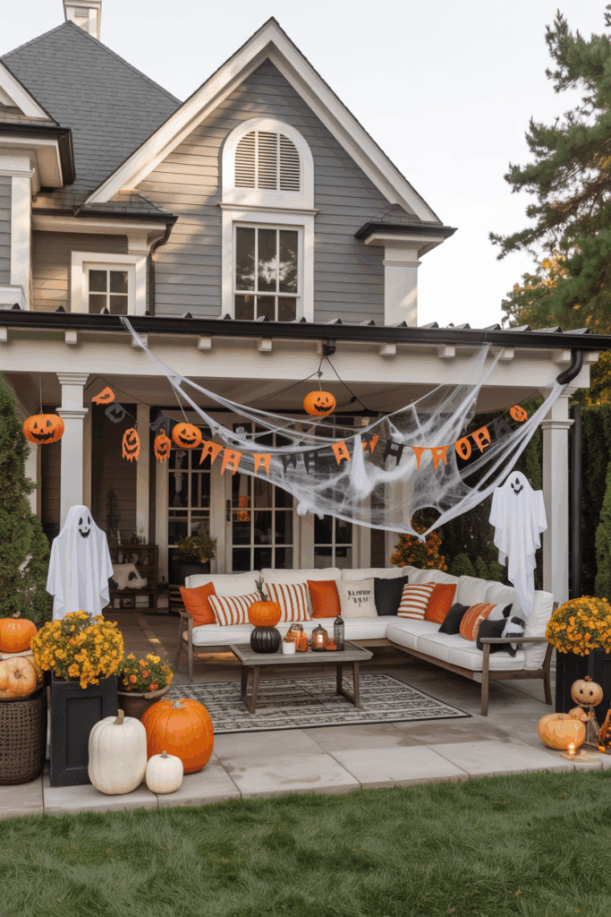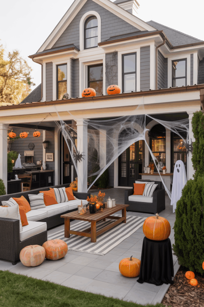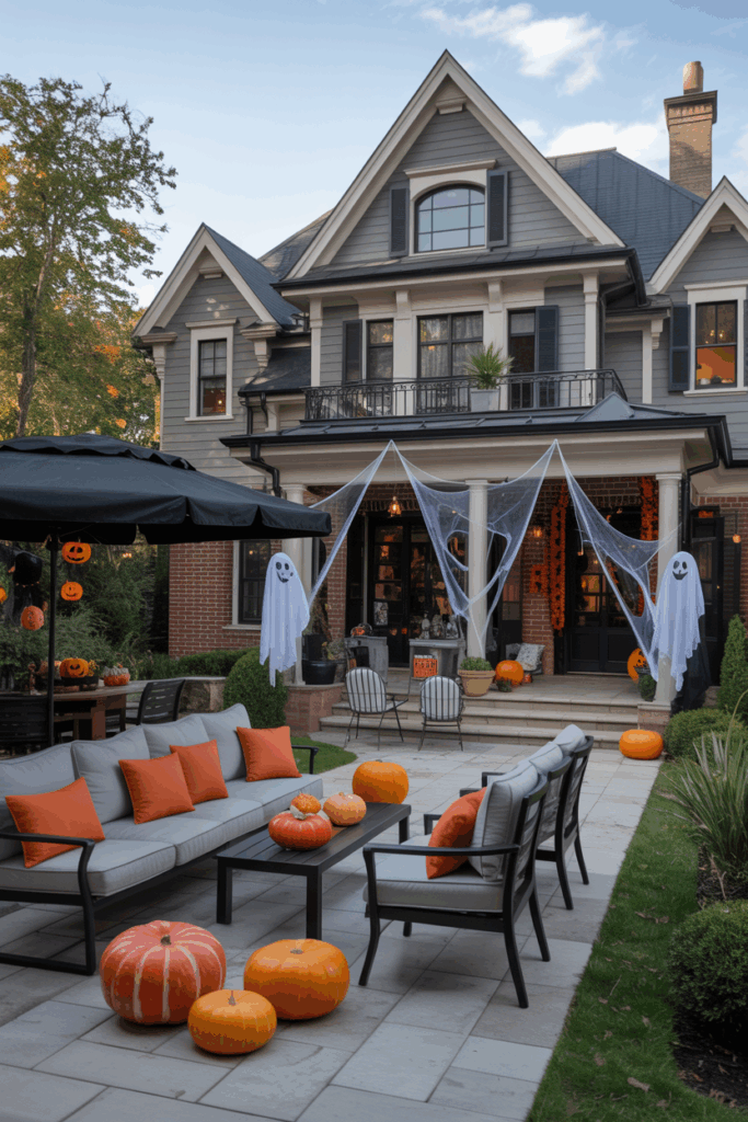 Turn your backyard into a cheerful Halloween hangout with playful, floating ghost decorations suspended above the porch. Delicate spiderweb garlands drape dramatically between the columns, framing the entryway and setting a spooky-yet-inviting tone. The patio seating area features sleek black and gray furniture accented with bold orange pillows, perfectly coordinating with the abundance of pumpkins scattered across the space. From striped pumpkins to classic orange varieties, the mix of sizes and styles keeps the décor fun and dynamic. Overhead, a black patio umbrella adds shade and contrast, while clusters of jack-o’-lanterns and hanging decorations bring the Halloween spirit to every corner.