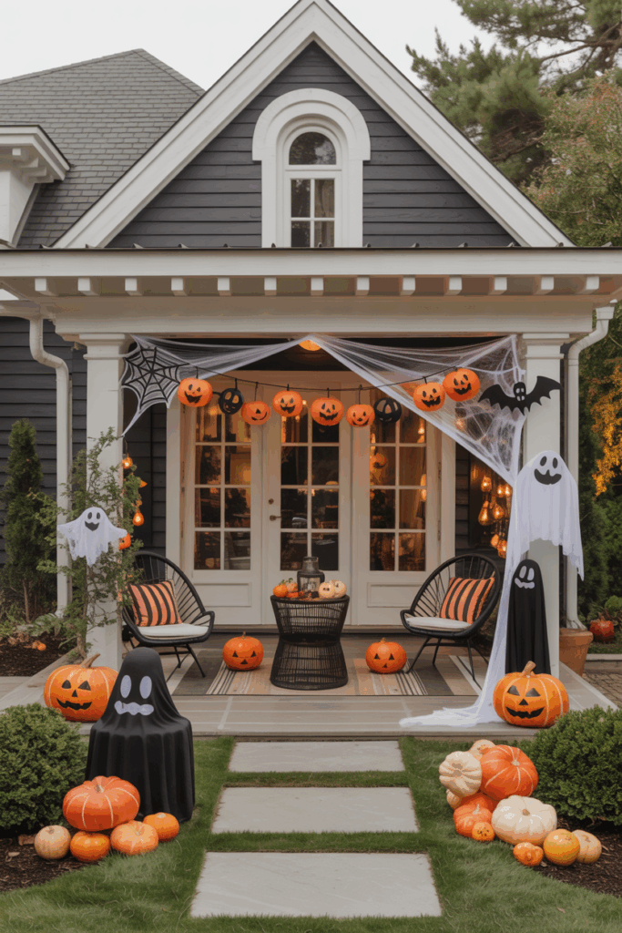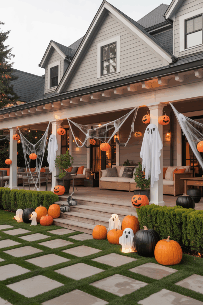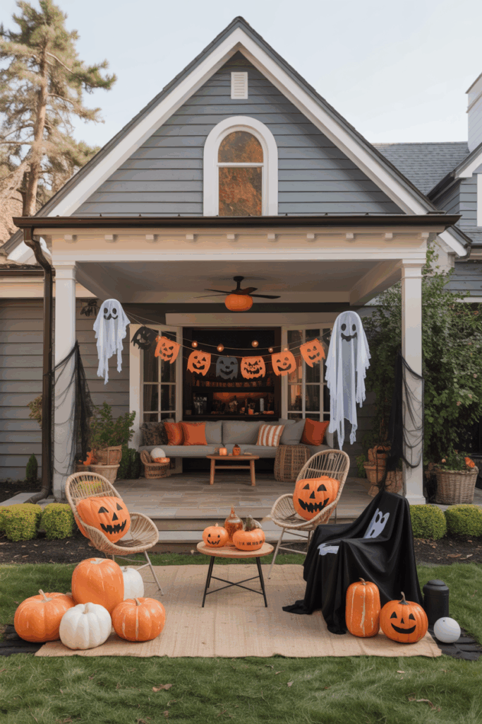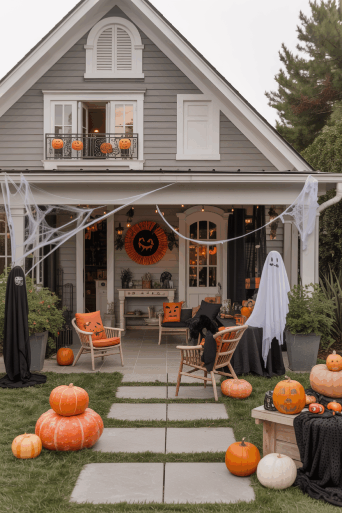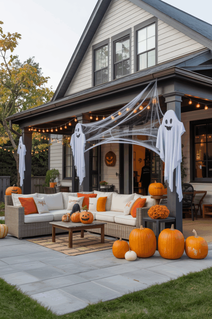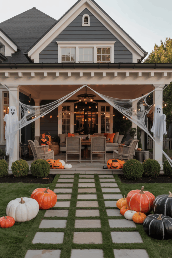 Turn your backyard into a cheerful Halloween hangout with playful, floating ghost decorations suspended above the porch. Delicate spiderweb garlands drape dramatically between the columns, framing the entryway and setting a spooky-yet-inviting tone. The patio seating area features sleek black and gray furniture accented with bold orange pillows, perfectly coordinating with the abundance of pumpkins scattered across the space. From striped pumpkins to classic orange varieties, the mix of sizes and styles keeps the décor fun and dynamic. Overhead, a black patio umbrella adds shade and contrast, while clusters of jack-o’-lanterns and hanging decorations bring the Halloween spirit to every corner.