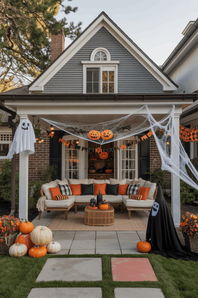 Transform your outdoor seating area into a warm and welcoming Halloween retreat with a mix of seasonal charm and spooky accents. This space blends neutral patio furniture with bold pops of orange and black through striped pillows, patterned cushions, and festive throw pillows. Carved jack-o’-lantern pumpkins sit atop the coffee table, adding a playful glow, while clusters of oversized pumpkins in orange, black, and white—paired with friendly ghost figurines—create a fun focal point near the seating. Draped spider webs stretch from the porch columns for just the right touch of eerie elegance, and additional pumpkins and Halloween décor are sprinkled across the patio and dining area to tie the look together. This setup is perfect for sipping cider with friends, hosting a costume party, or simply enjoying crisp autumn evenings in style.