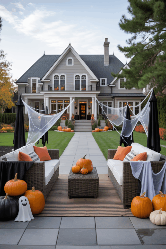 Make a bold statement this Halloween by framing your outdoor seating area with oversized, draped spiderwebs that stretch dramatically between black patio umbrellas. These airy webs create instant spooky impact while still letting the beauty of the home and lawn shine through. Neutral wicker sofas with crisp white cushions and pops of orange and black in the pillows keep the look modern and inviting. Clusters of pumpkins—ranging from classic orange to sleek black—anchor each seating corner, while a friendly ghost figure adds a whimsical touch. The symmetry of the setup, paired with the grand entry lined with more pumpkins, turns the entire walkway into a festive focal point perfect for greeting guests.