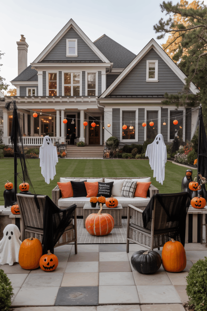 Bring cheerful Halloween energy to your outdoor space with a mix of friendly ghost décor and glowing pumpkin accents. String lights with orange lanterns stretch across the lawn, creating a festive canopy above the seating area. A wicker sofa and matching chairs are styled with a blend of orange, black, and plaid pillows, adding warmth and texture. Carved and painted pumpkins are scattered throughout—on the coffee table, at the base of chairs, and along the patio edges—while two floating ghost figures frame the seating for a whimsical, eye-catching touch. This setup strikes the perfect balance between spooky and inviting, making it an ideal spot for gathering with friends on crisp fall evenings.