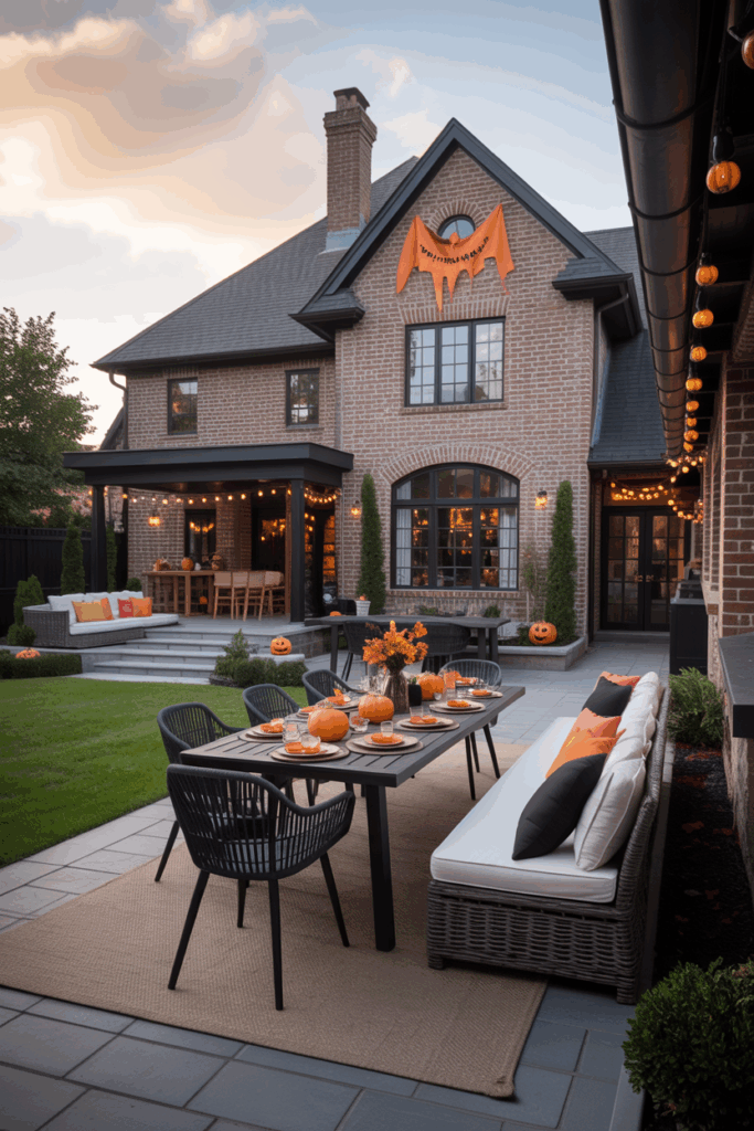 This beautifully styled outdoor dining space offers a sophisticated yet festive approach to Halloween décor. A sleek black dining table, paired with woven chairs and a cushioned bench, is set for six with pumpkin-shaped centerpieces, orange plates, and clear glassware, creating a vibrant and inviting tablescape. A vase of autumn florals adds height and texture to the arrangement, while scattered jack-o’-lanterns bring in classic Halloween charm. Overhead, string lights and pumpkin-shaped lanterns cast a warm glow, perfectly complementing the crisp evening air. In the background, cozy lounge seating with themed pillows and more carved pumpkins continues the festive flow, while an oversized orange bat decoration on the home’s upper facade makes a playful statement that can be seen from across the yard. This setup strikes the perfect balance between seasonal fun and refined outdoor entertaining.
