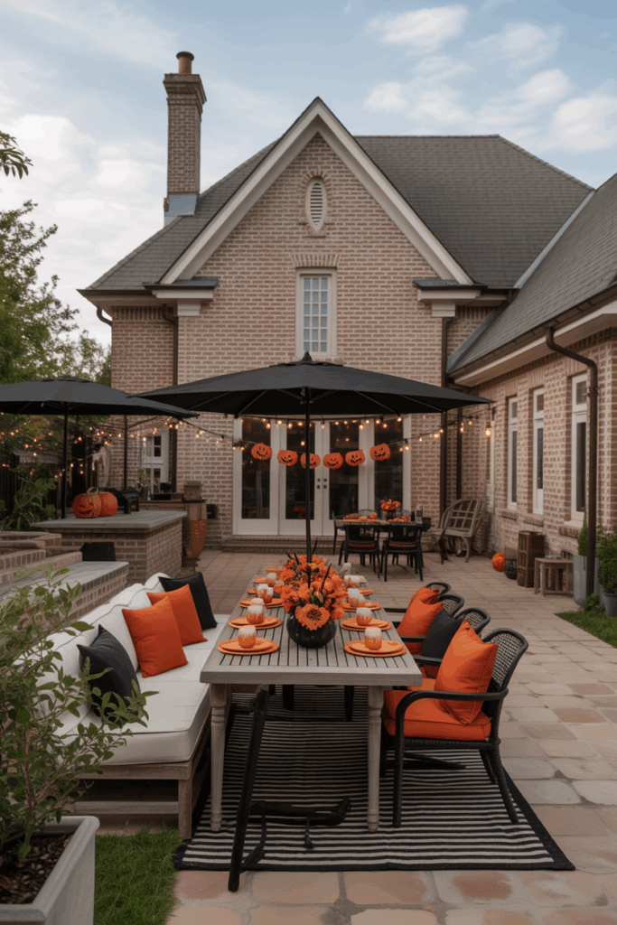 Orange Stripes & Pumpkins Patio – Cozy Halloween Conversation Zone
