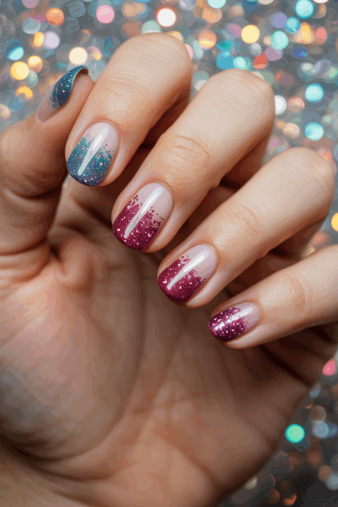Glitter ombre nails blend sparkling glitter with smooth color fades. This style adds a festive shine without being too bold. It works well with many holiday colors like red, gold, or silver. The glitter usually fades from dense at the tips to light near the base.