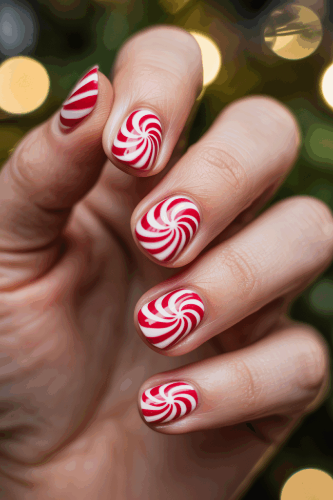 Peppermint swirl nails feature red and white patterns inspired by candy canes. They often include glitter or pearl accents for a festive look.