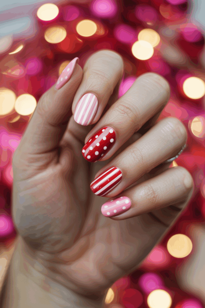 This color mix creates a classic holiday look with a fresh twist. Soft pink tones add a gentle touch, while red brings vibrant energy. White stripes or accents balance the design and keep it festive. Together, these colors offer a simple yet stylish option for holiday nails.