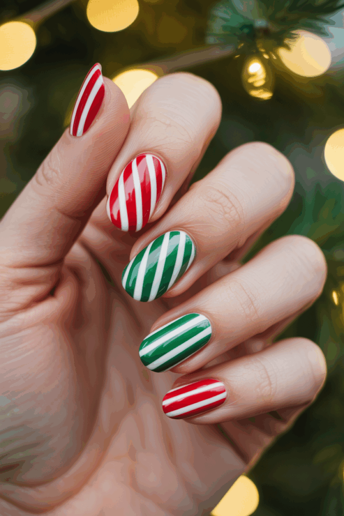 Candy cane stripes are a classic holiday nail idea. They usually feature red and white stripes that create a festive look.