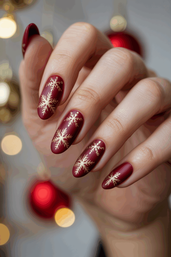 Glossy burgundy nails paired with matte snowflake accents offer an elegant take on winter nail art that feels both rich and refined. The deep burgundy shade exudes warmth, luxury, and sophistication—perfect for evenings by the fire or formal holiday events. The contrast between the glossy finish and the matte white snowflakes adds subtle texture and dimension without feeling busy. This look can be customized easily—use one accent nail with a snowflake design for a minimal effect, or add snowflakes to every nail for a more whimsical vibe. Burgundy pairs beautifully with gold accessories, velvet fabrics, or deep jewel tones, making it one of the most wearable holiday shades. It’s a classic yet creative choice that feels elevated and timeless, just like the season itself.