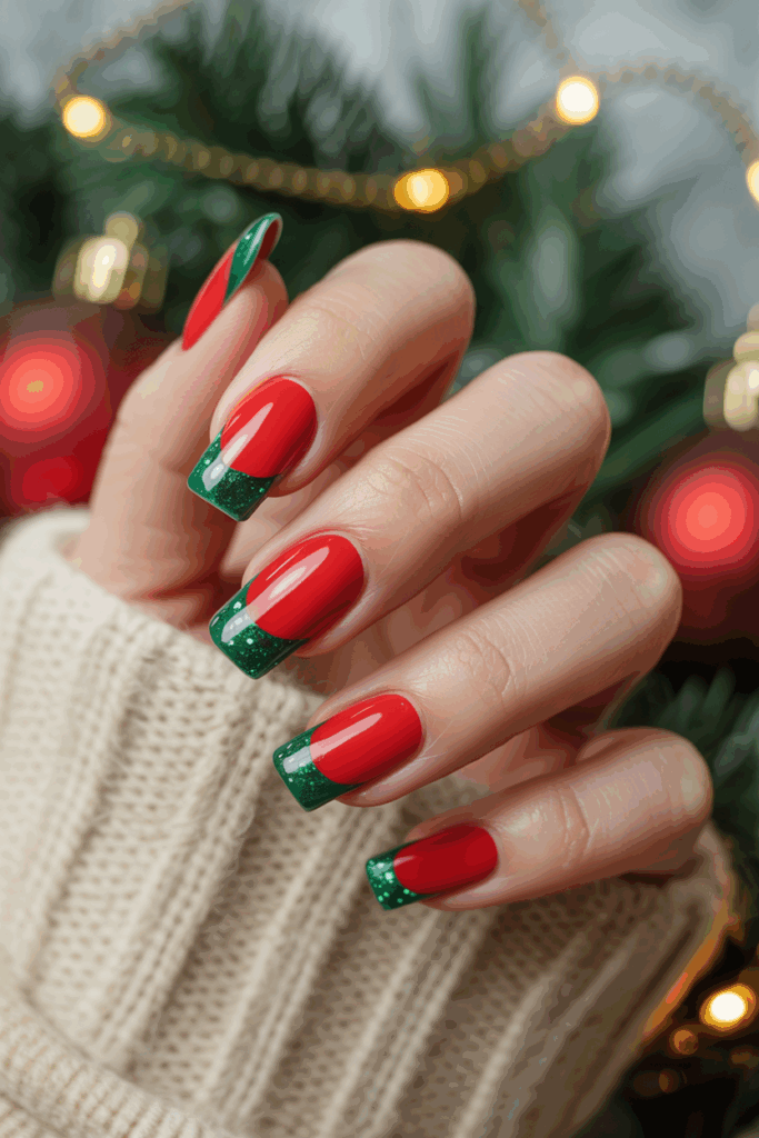 Classic red and green nails are timeless symbols of the season, and this design gives them a modern twist. Instead of full-color nails, sleek French tips in glossy red and emerald green add just enough festive flair while still looking refined. The combination feels traditional yet chic, perfect for anyone who loves holiday spirit without going overboard. Adding a bit of subtle sparkle or metallic striping can make the look even more polished for parties or family gatherings.
