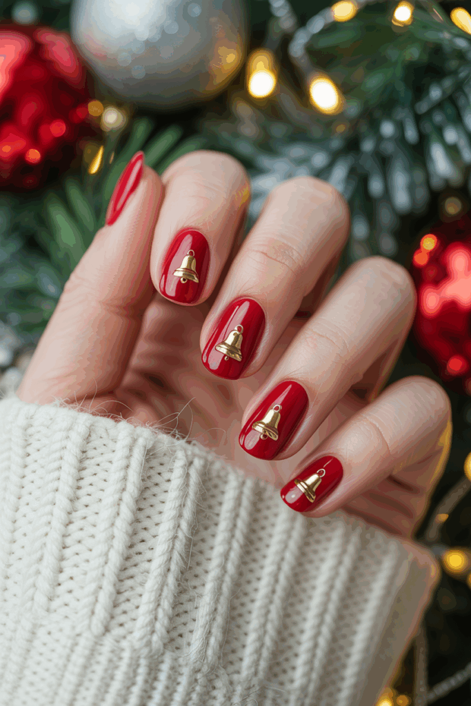 Classic red nails adorned with tiny gold bells strike the perfect balance between festive charm and elegant detail. The glossy red polish captures the warmth and energy of the season, while the dainty bell designs add a touch of whimsy without overpowering the look. Each small bell glimmers like a miniature ornament, creating a manicure that feels joyful yet refined. You can hand-paint the bells for a delicate artistic touch or use nail decals for a quicker version that still looks professional. This design complements nearly any holiday outfit—from cozy sweaters to cocktail dresses—and adds a delightful, merry note to your overall style. It’s a timeless Christmas manicure that embodies everything the season represents: warmth, music, and celebration.