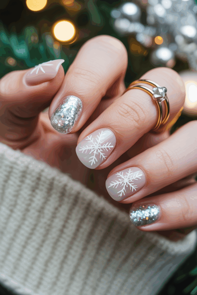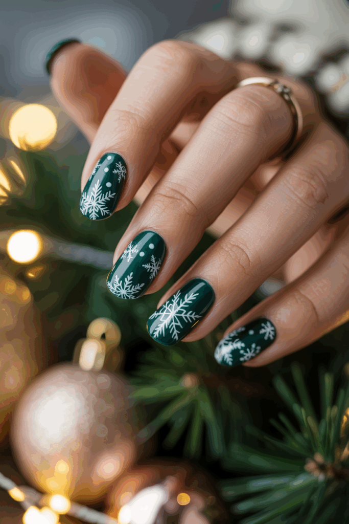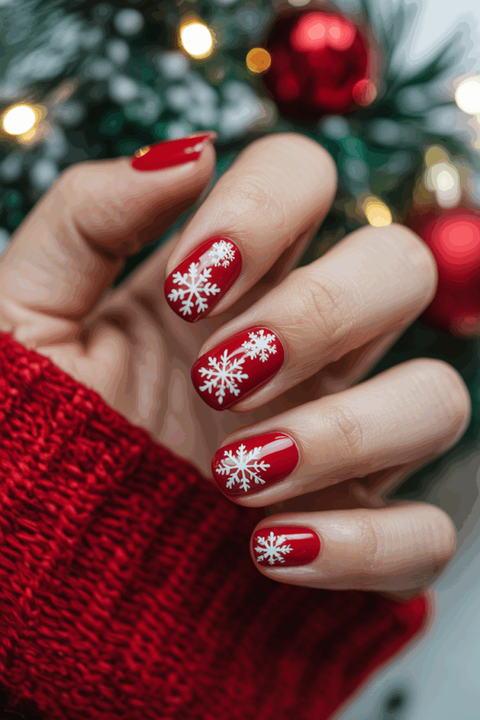 This design blends the richness of a high-gloss red polish with the crisp detail of hand-painted white snowflakes. The simple contrast creates a balanced, festive aesthetic that works beautifully for the holiday season. A single accent nail featuring delicate snowflake art is all you need to elevate a classic manicure into something magical. It’s perfect for anyone who loves understated elegance with a wintry touch.