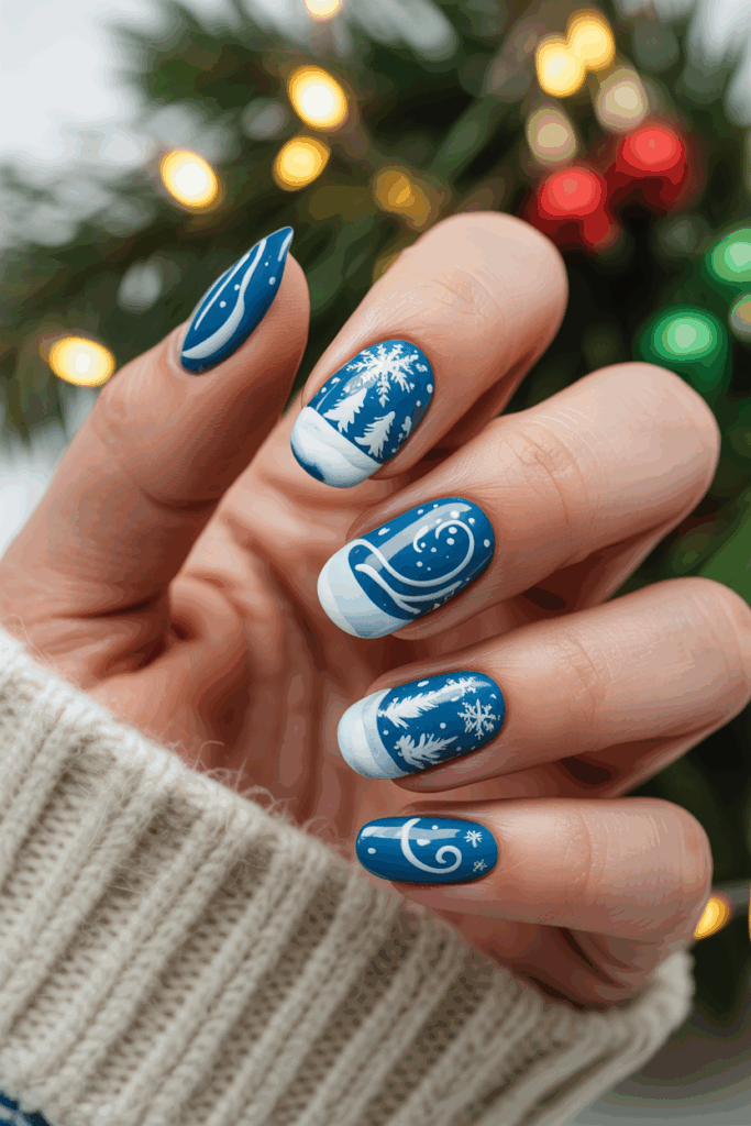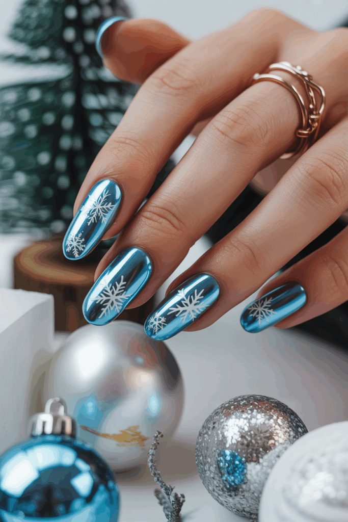 Icy blue chrome nails with white snowflakes combine the cool shimmer of metallic polish with the intricate beauty of winter patterns. The reflective chrome base gives your nails a mirror-like shine that instantly catches the light, while the delicate white snowflakes add a crisp, frosty accent. This manicure perfectly captures the feeling of a snowy December morning, elegant enough for special occasions yet subtle enough for everyday wear. The chrome finish enhances the winter aesthetic, creating depth and movement as light glides across the surface. For a softer variation, try blending the chrome with a hint of pearly white or silver ombré at the tips. It’s an ideal choice for anyone who loves cool-toned, graceful nail designs that channel both Christmas and winter wonder in one stunning look.