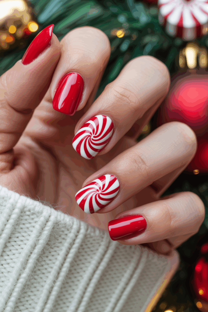 Nothing says Christmas like candy cane stripes. This playful red-and-white pattern brings a sweet, nostalgic charm to your nails while still feeling polished and fun. You can keep the stripes thin for a modern, subtle effect or make them bolder for a statement look. Add a touch of silver glitter on one or two accent nails for a hint of sparkle that ties everything together.