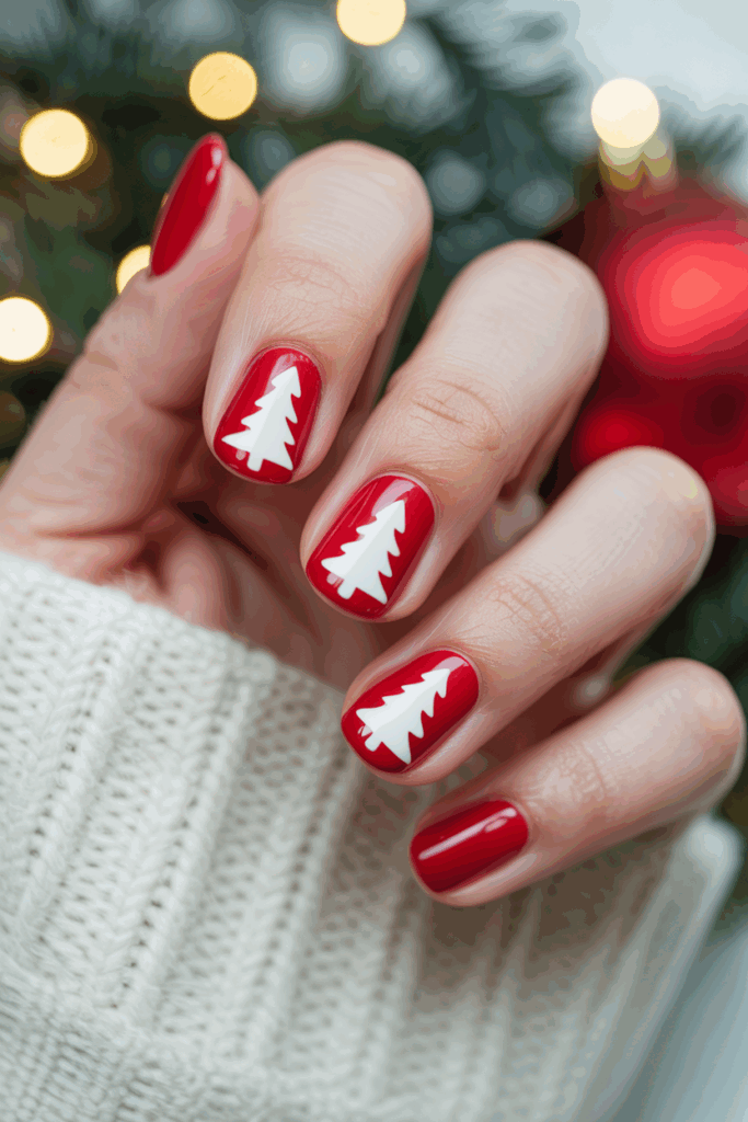 Pine tree silhouette nails are an elegant nod to nature and Christmas tradition. A sheer or nude base provides a minimalist backdrop, while dark green or black pine tree designs add a crisp, wintry contrast. The simplicity of this look is what makes it so captivating—it feels festive without being overly decorative. The fine, tapered brushstrokes mimic the shape of evergreen branches, evoking the calm of snowy forests and holiday nights spent by a twinkling tree. For added charm, a touch of white detailing or subtle glitter can simulate freshly fallen snow on the pine branches. This manicure is perfect for those who appreciate understated holiday beauty—clean, modern, and effortlessly chic. It pairs beautifully with soft knitwear and neutral winter fashion, making it a go-to for minimalists who still want a touch of Christmas magic.