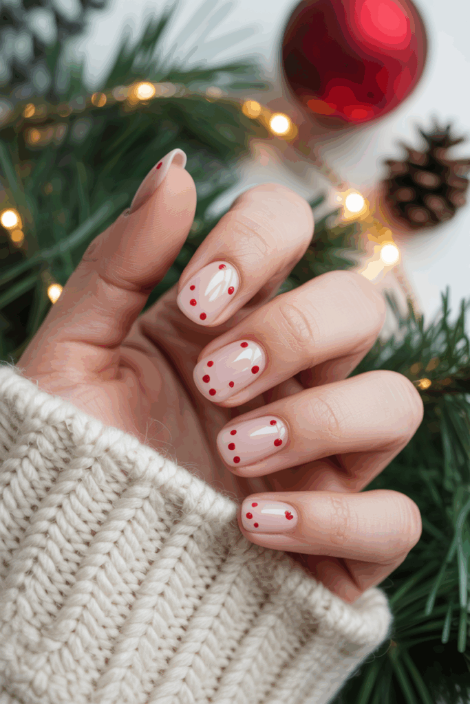 Few designs are as playful and charming as red nails sprinkled with white polka dots and tiny bows. This cheerful look combines the classic holiday palette of red and white with a hint of whimsy that instantly brightens your winter wardrobe. The polka dots mimic falling snow, while miniature white bows add a delicate, gift-like accent that feels both festive and feminine. This style works beautifully on short or medium-length nails and looks especially cute paired with cozy sweaters or party outfits. You can keep it simple with dots and one accent bow, or create full “present” nails by crossing white stripes and adding a bow in the center. The design feels joyful and nostalgic, like a nod to vintage Christmas decor, but with a fresh and polished modern twist.