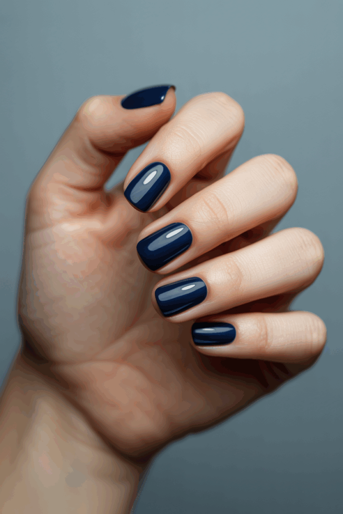 Glossy navy blue nails offer a sleek and polished look. The shine adds depth to the deep blue color, making nails appear smooth and well-kept.