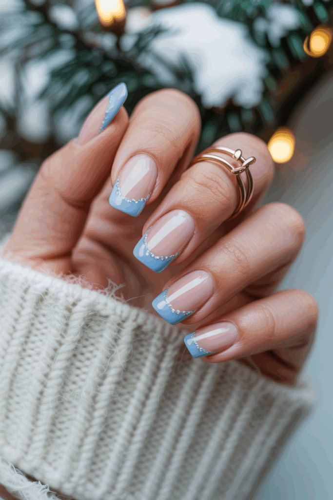 This nail style uses baby blue tips instead of the classic white. The soft blue shade gives a fresh, modern look.