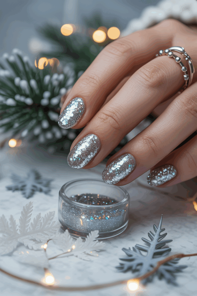 Icy silver glitter nails offer a sleek and modern look for January. The design uses cool silver tones with fine glitter to create a subtle shine.