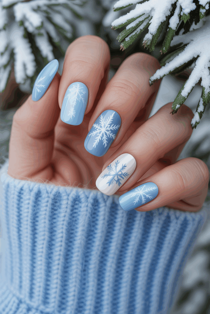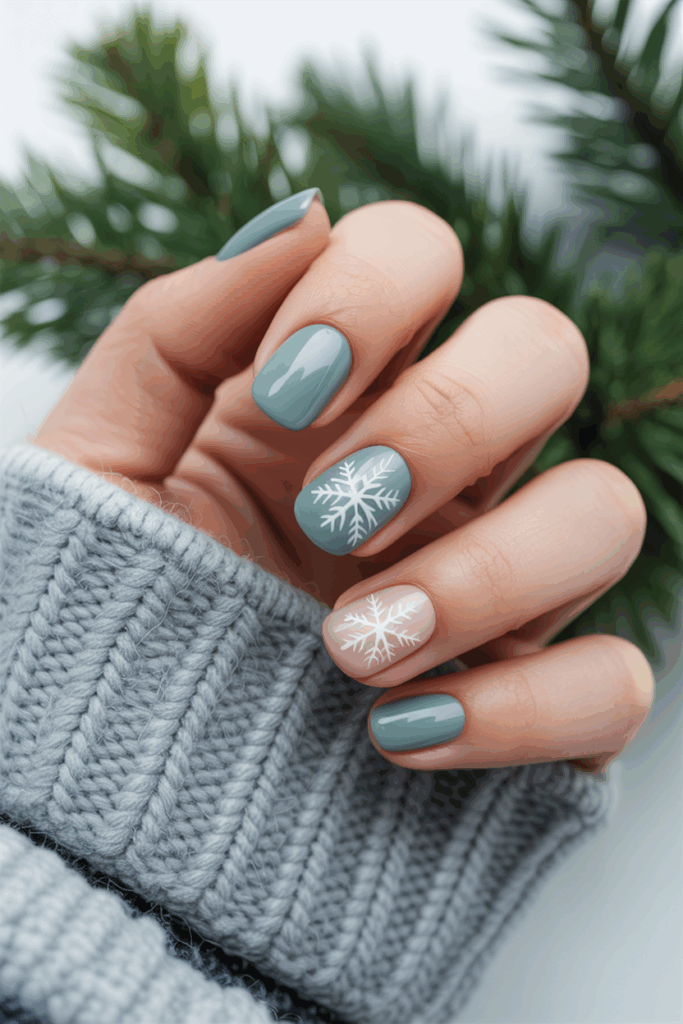 Snowflake accent nails add a simple but stylish touch to any winter manicure. They often feature one or two nails with delicate snowflake designs while the other nails remain neutral or solid colored.