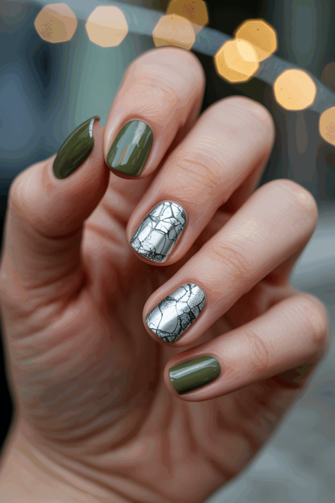 Olive is a late-fall essential, but when you add small icy silver details, it suddenly shifts toward winter. Think silver dots, a thin silver French tip, or a tiny diagonal line across one nail. Just enough to change the tone.