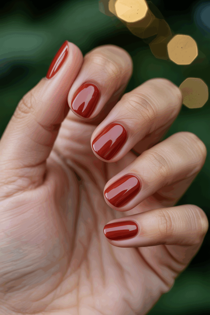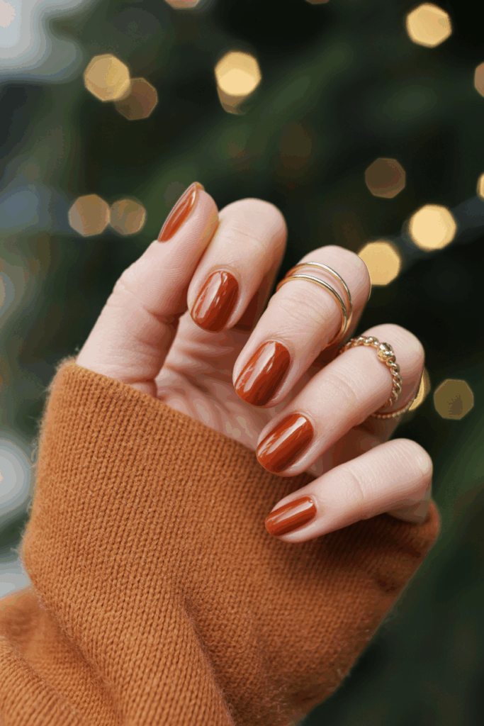 Before the full December reds come out, there’s this warm, almost cinnamon-spiced red that just feels right. It’s deeper, slightly brownish, and full of warmth. It’s the red you wear when you want the mood of holiday nails without the commitment of bright cherry Christmas red.
