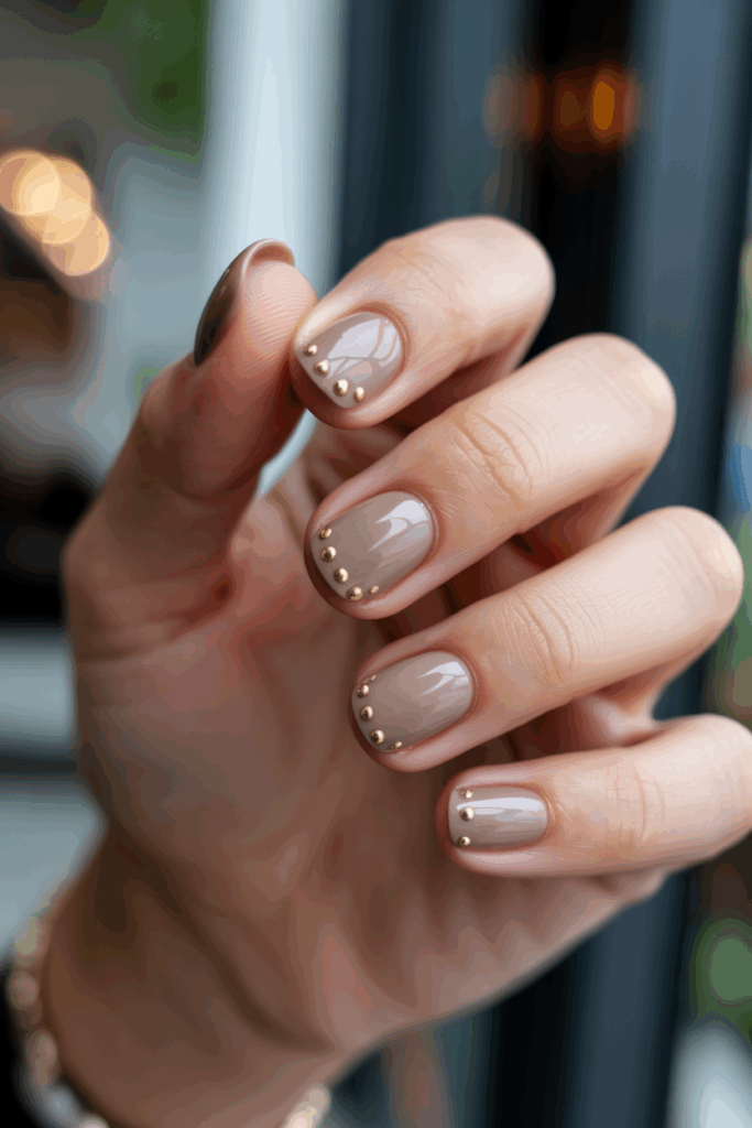 Latte nails are soft and comforting — exactly what you want during this in-between time. Add a tiny gold stud (or two) and suddenly they shift toward December. The studs give just enough sparkle without turning the manicure into a full-glam look.