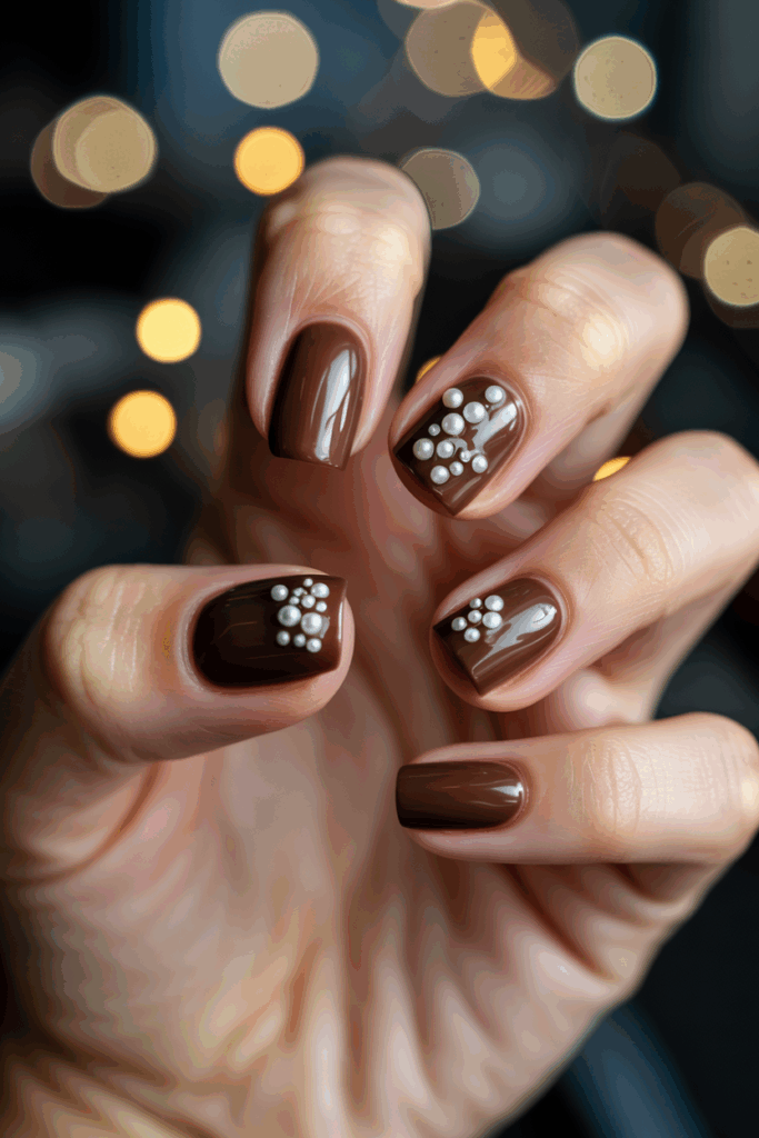 Dark brown nails instantly feel cozy in the fall, but adding pearl accents softens them just enough to carry into winter. There’s something luxurious about the combo — like a favorite box of holiday chocolates or a winter wedding invitation. The pearls bring a cool, snowy contrast to the deep brown underneath.