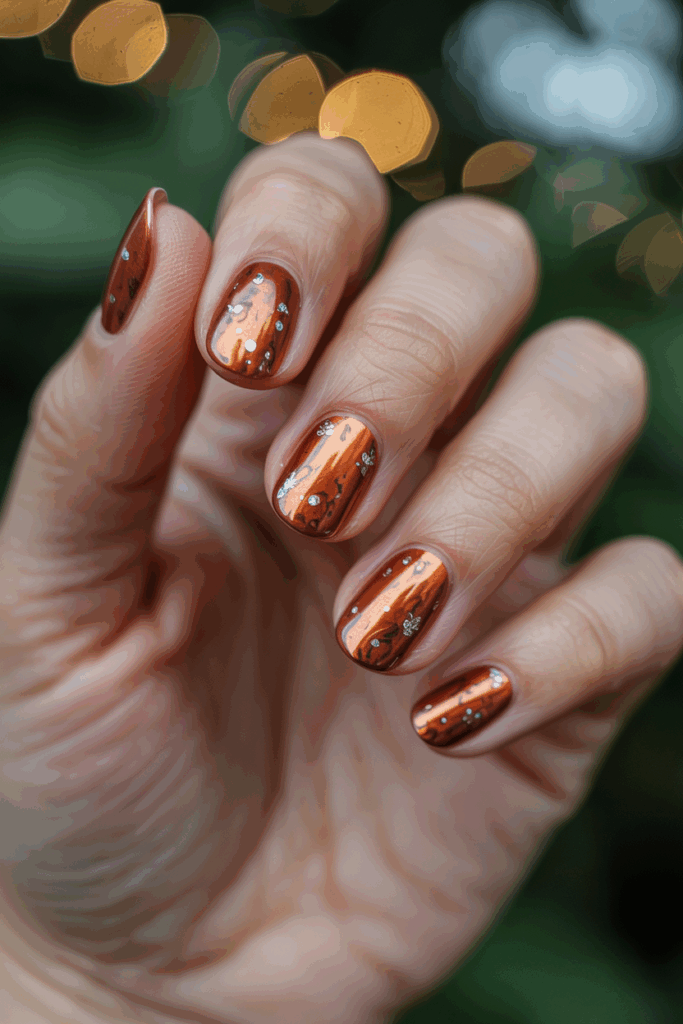 As we transition from late fall into the festive season, metallic nails are a fun way to celebrate. The image showcases a stunning combination of silver and bronze shades that perfectly capture the spirit of the holidays. The shiny finishes reflect light beautifully, making them ideal for those sparkling nights out.