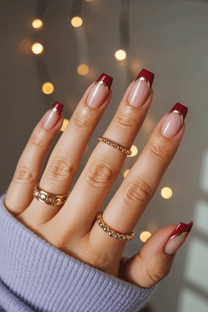 Holiday French tips don’t have to mean sharp red and green. A sheer wash of cranberry over the whole nail, topped with a thin gold micro-tip, is stunning for this transition season. It’s delicate, elegant, and a little unexpected. You get just enough festive sparkle but without the loud glitter or big designs.