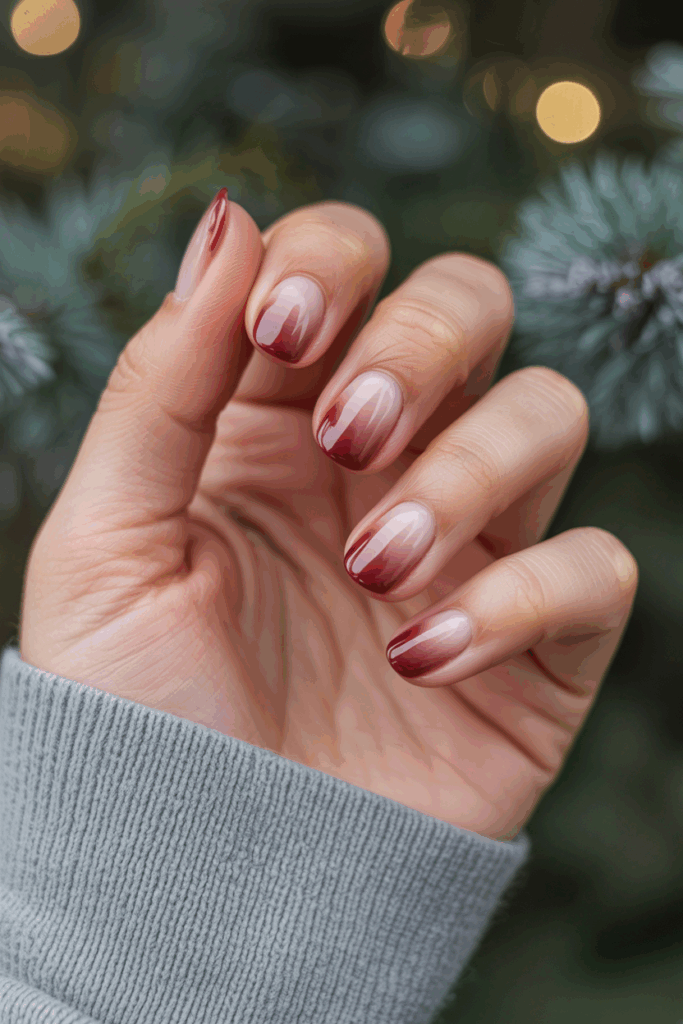If ombré had a seasonal mood swing, this would be it. Starting with a deep maple-brown at the cuticle and fading into a juicy cranberry tip, this gradient feels exactly like that moment when Thanksgiving leftovers are still in the fridge but someone has already dropped off peppermint bark.