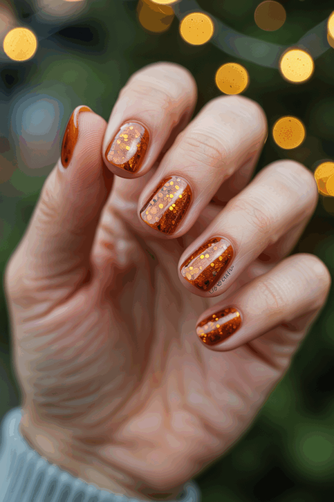 If your fall heart is still holding onto pumpkin spice season, but your winter heart is ready to twinkle, this blend is adorable. Start with a soft burnt orange and layer a little gold glitter on top — not too much, just enough to hint at holiday sparkle.