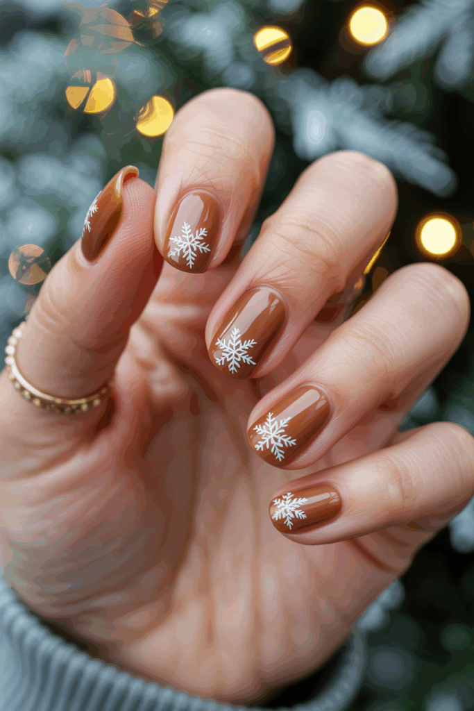 If you’re in the mood for nails that feel like hot cocoa one minute and Christmas lights the next, this is your inspo corner. Think warm earthy browns, a little plaid moment, a sprinkle of gold, maybe even a snowflake or two. Late fall nails get to be soft, cozy, and slowly building toward all things merry. So settle in and scroll… we’re easing into the season one manicure at a time.