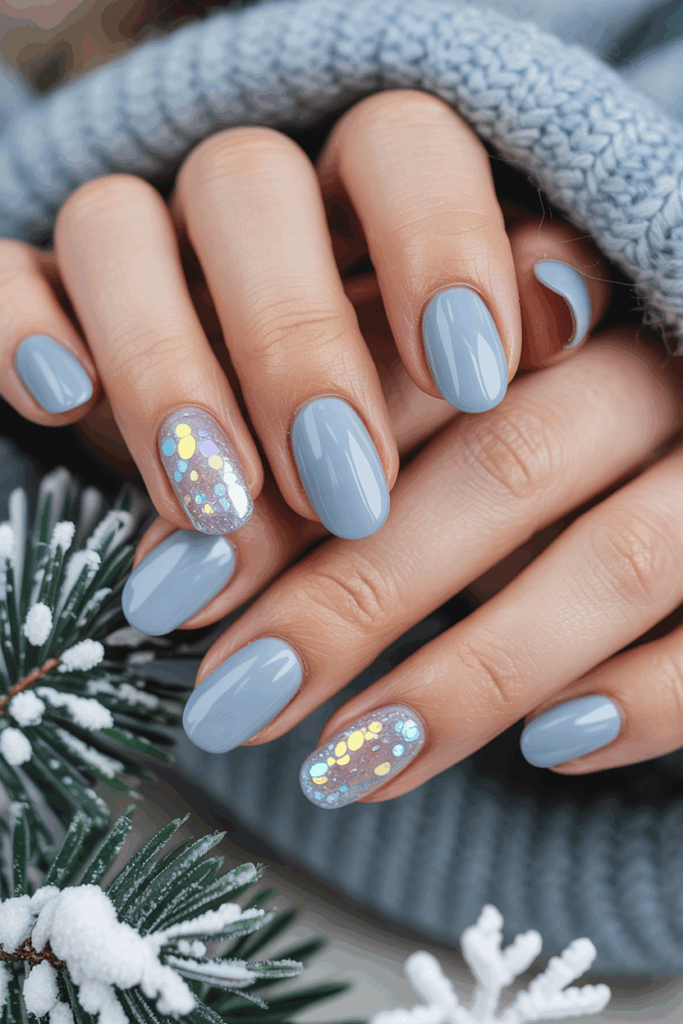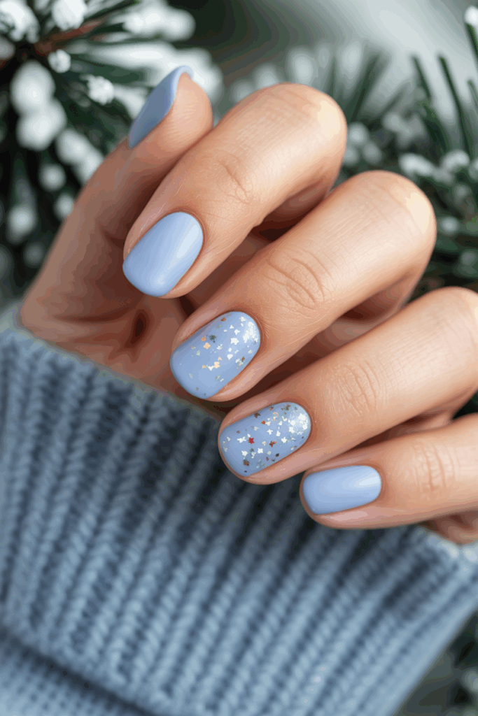This style features a soft blue matte base that looks calm and smooth. Small sparkling confetti pieces add a subtle shine without overpowering the muted color. It creates a balanced look that is both elegant and gently eye-catching for winter.
