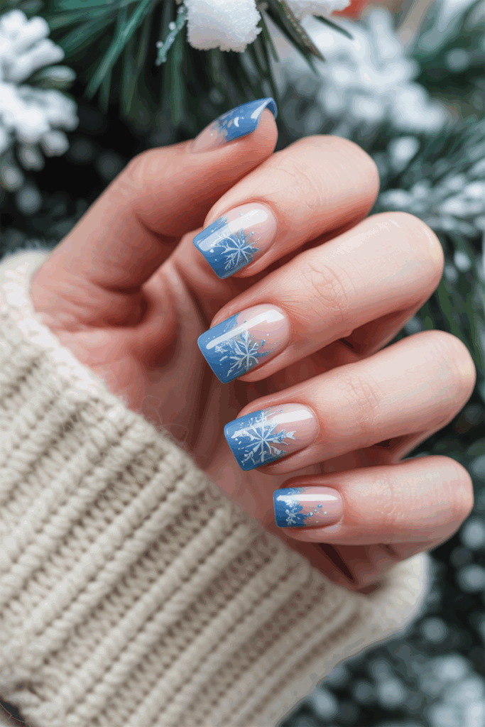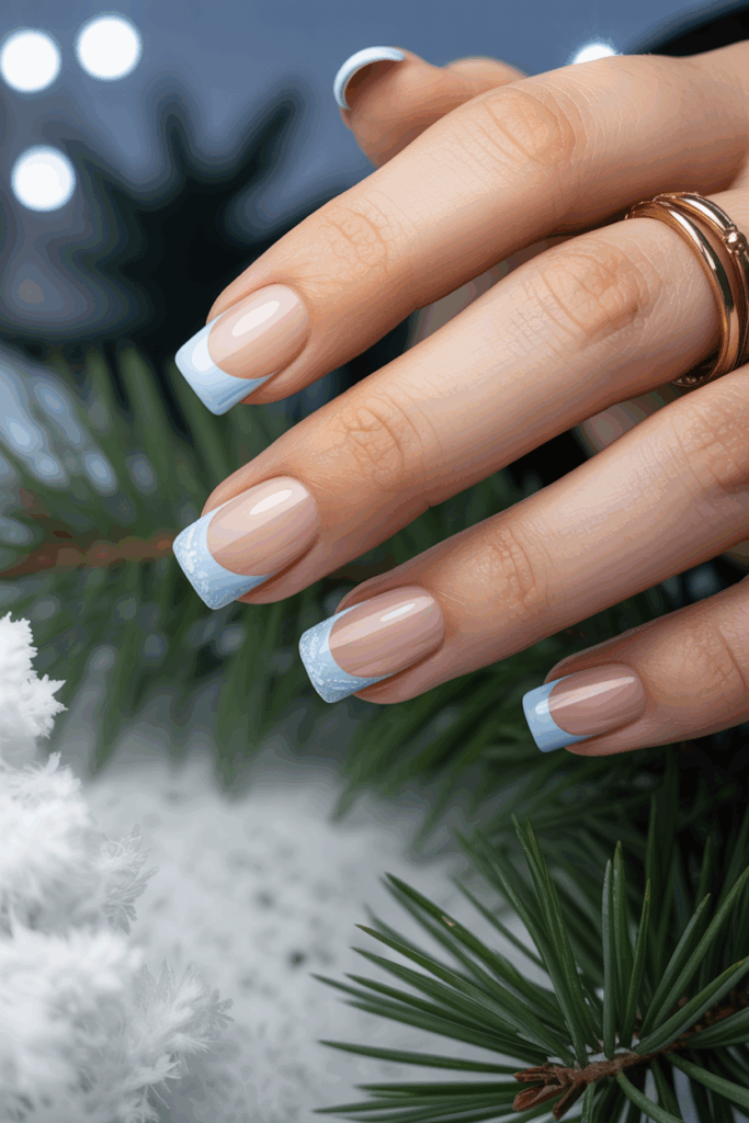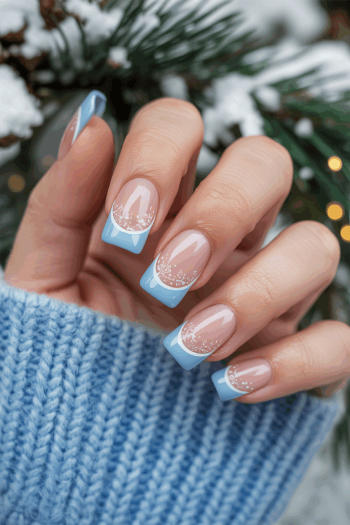 This design combines soft light blue tips with crisp white edges. The contrast gives a cool, clean look that fits winter well.