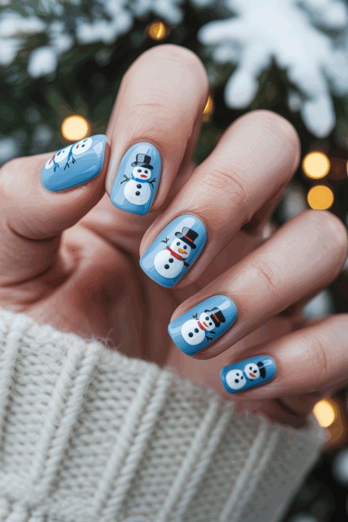This style features a shiny sky blue base that looks clean and fresh. Small snowman designs are added on each nail for a subtle winter touch. The glossy finish helps the snowmen stand out without being too bold.
