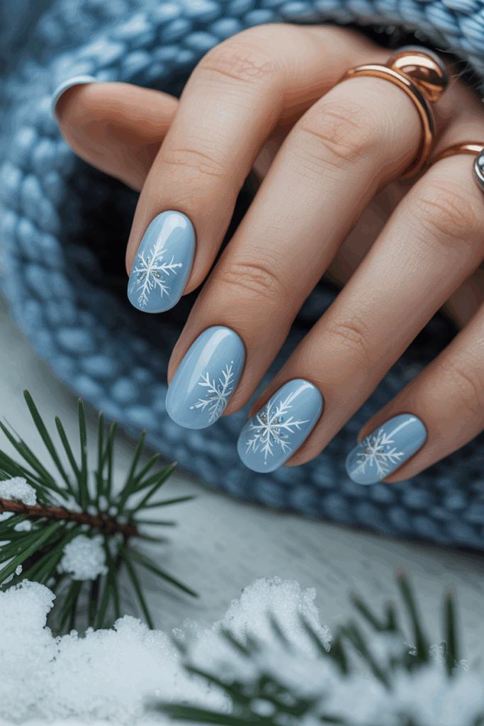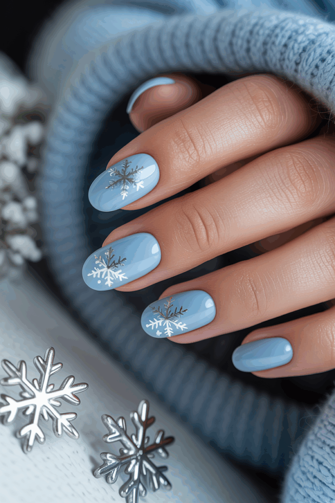 Light blue nails with shimmering snowflake patterns create a simple, elegant winter look. The soft blue base pairs well with sparkly white or silver snowflakes. This design adds a festive yet understated touch suitable for any winter occasion.