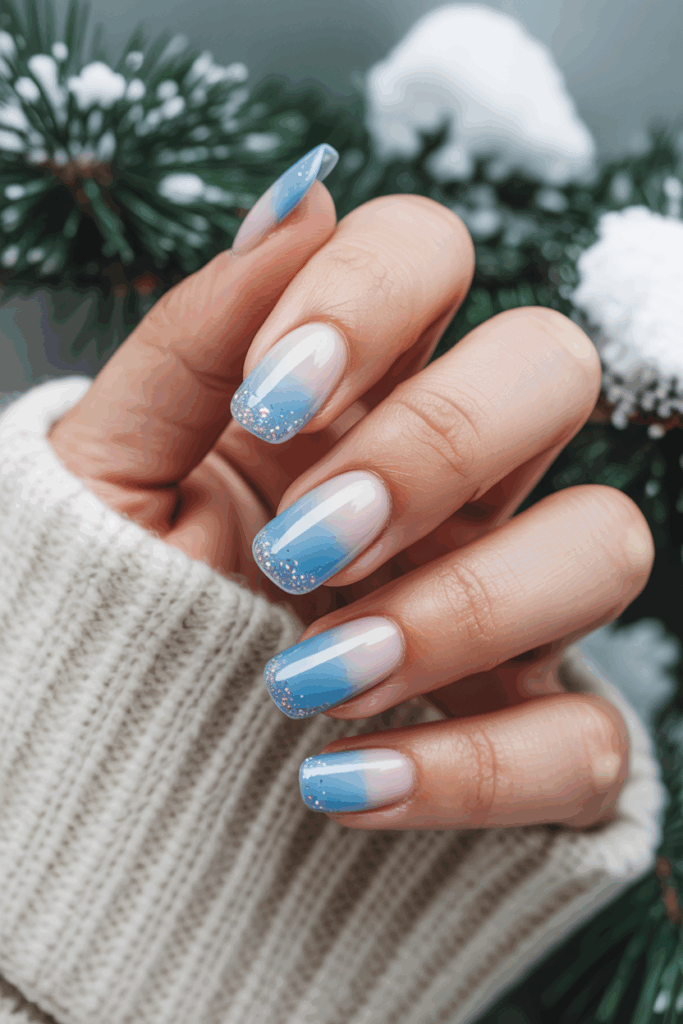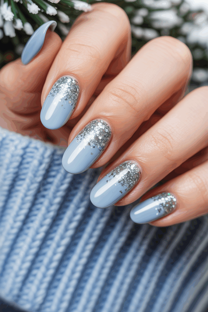 This design features a smooth gradient from silver glitter at the nail base to a light blue tip. It creates a soft, elegant look that fits winter styles.