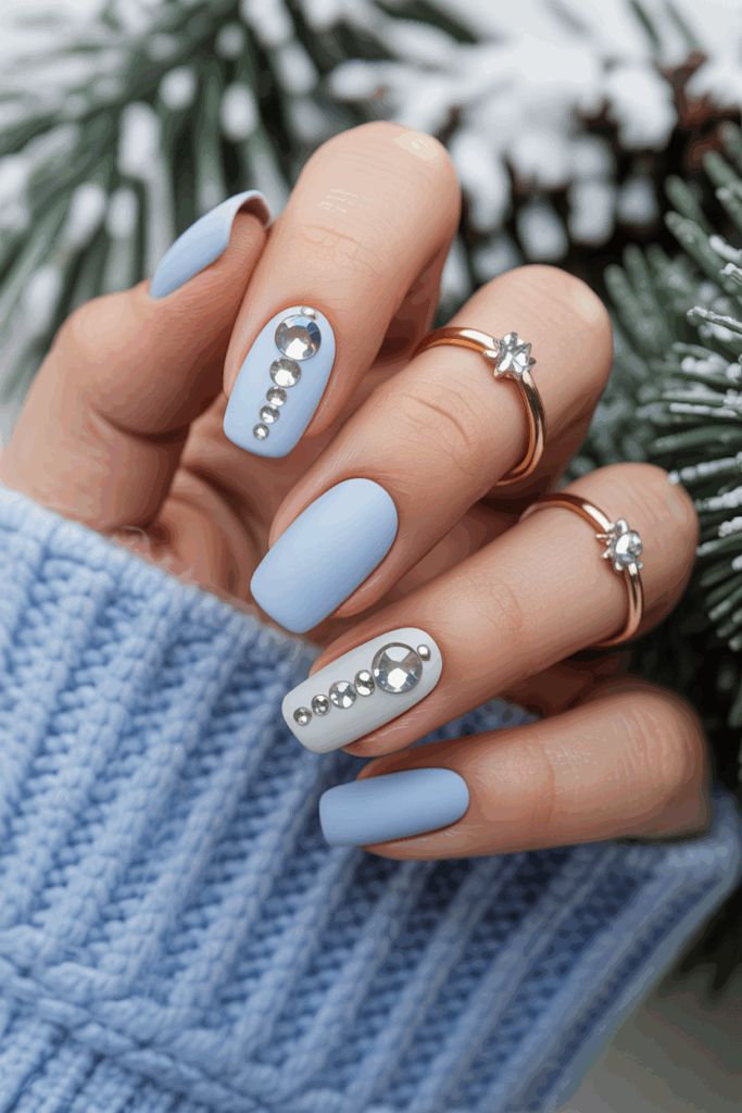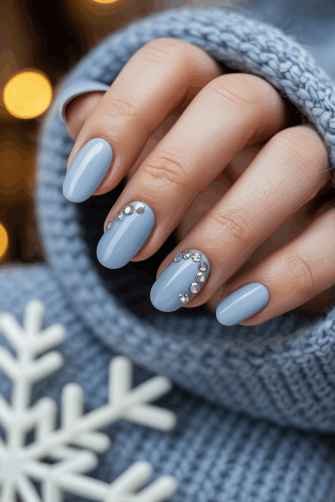 Light blue nails with tiny crystal studs add a subtle touch of sparkle. The crystals create a delicate contrast against the soft blue base. This look is simple yet elegant, perfect for winter. It works well on both short and long nails.