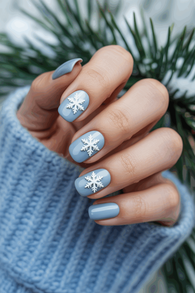 This style features a soft pale blue base that offers a calm, wintery feel. The 3D snowflake embellishments add texture and depth, making the nails stand out without being too flashy. It is a balanced design perfect for both casual and festive occasions.