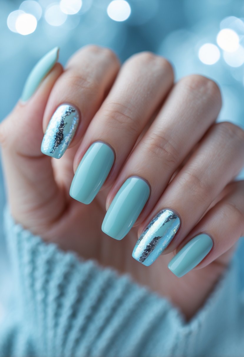 Seafoam blue nails offer a soft, calming winter look. The silver foil highlights add a subtle shine, catching light for a delicate effect. This style blends a natural tone with metallic accents for a simple yet modern manicure suitable for daily wear.