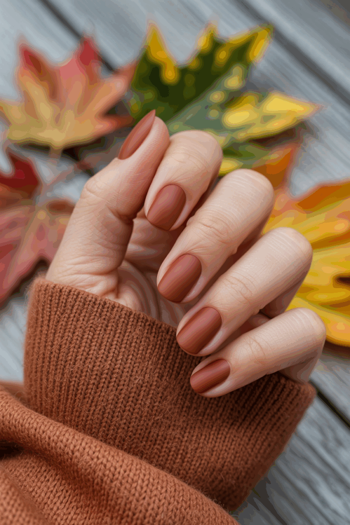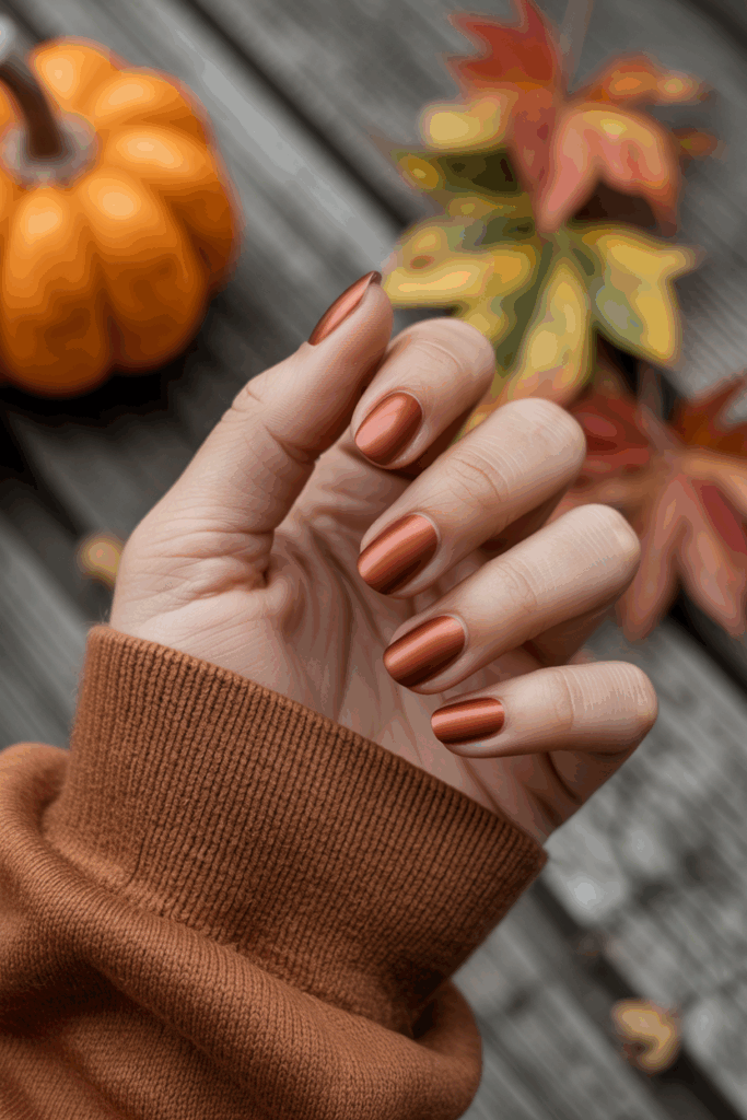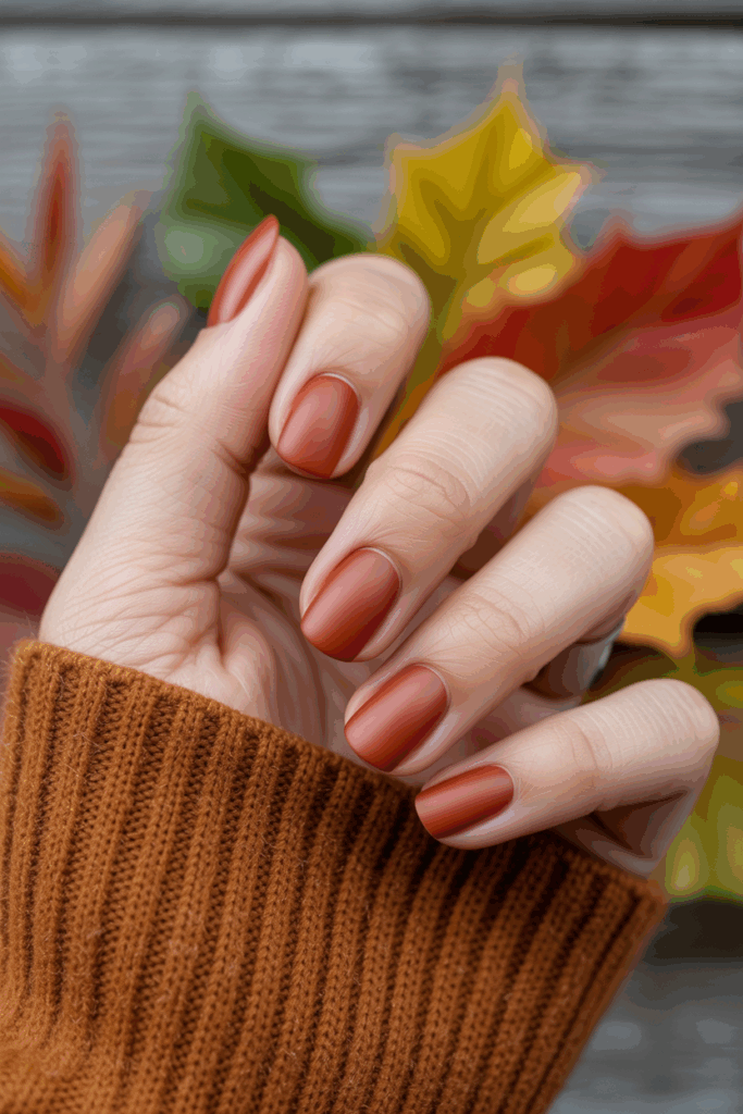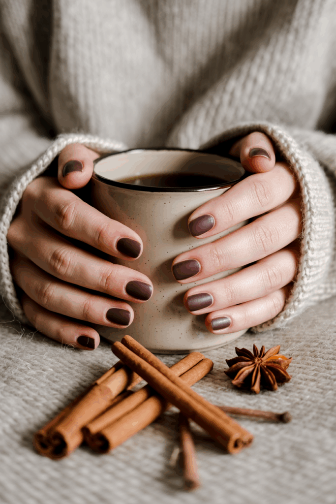 Pairing this nail color with soft, neutral fabrics, like the cozy knit seen in the background, adds to the overall warmth. It’s a perfect look for sipping hot cocoa or enjoying a pumpkin spice latte on a chilly day.