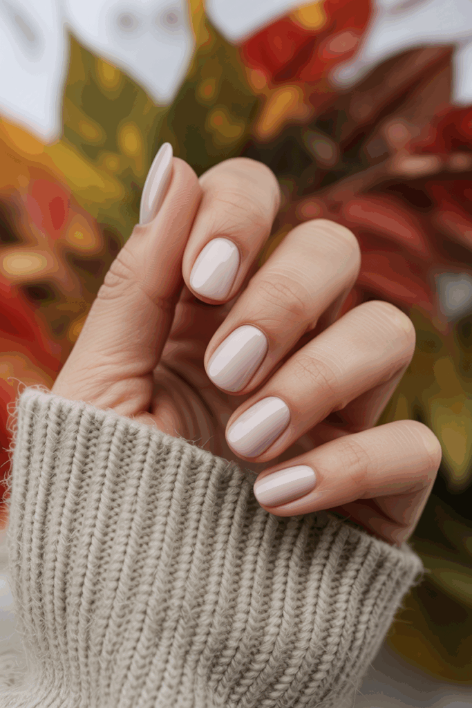 The soft beige color complements the warm hues of the surrounding knitted fabrics and autumn leaves. This color choice is perfect for fall, evoking feelings of comfort and warmth. The combination of the creamy nails with the rich textures of the sweater and scarf creates a harmonious look that feels inviting.