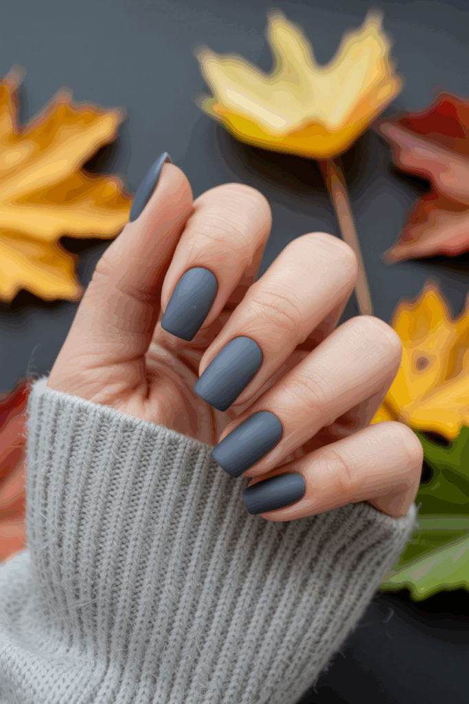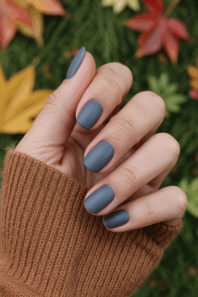 Slate blue is a soothing color that perfectly captures the essence of fall. In this image, the matte nails showcase a beautiful slate blue shade, adding a touch of elegance to the hands. The color complements the autumn scenery in the background, with vibrant leaves creating a stunning contrast.