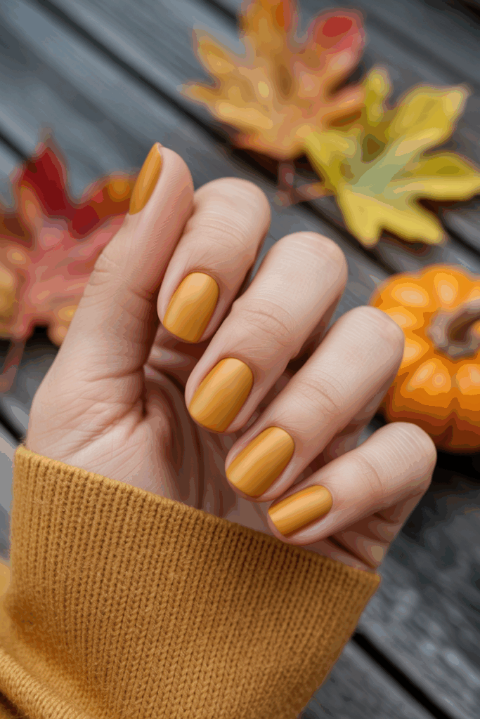 In the image, you can see hands adorned with this lovely mustard hue, perfectly complementing the autumn flowers around them. The contrast between the vibrant nails and the rich colors of the flowers creates a delightful visual.