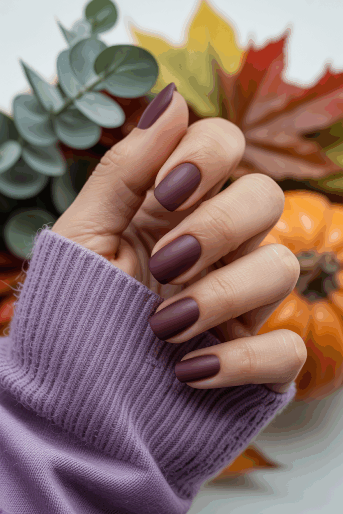 The nails are styled in a glossy finish, which adds a touch of elegance. This look is perfect for cozy gatherings or a night out. The contrast between the plum nails and the natural elements around them enhances the overall vibe.