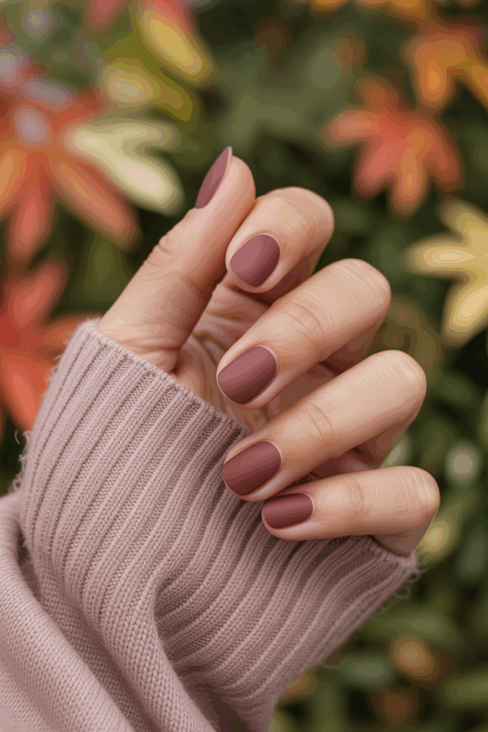 The fallen leaves scattered around enhance the autumn vibe, making this nail color feel even more seasonal. Dusty mauve pairs well with earthy tones, making it versatile for different outfits and occasions.