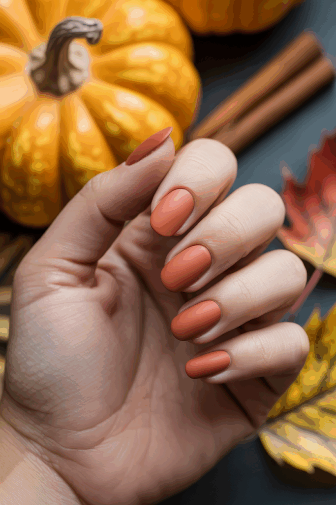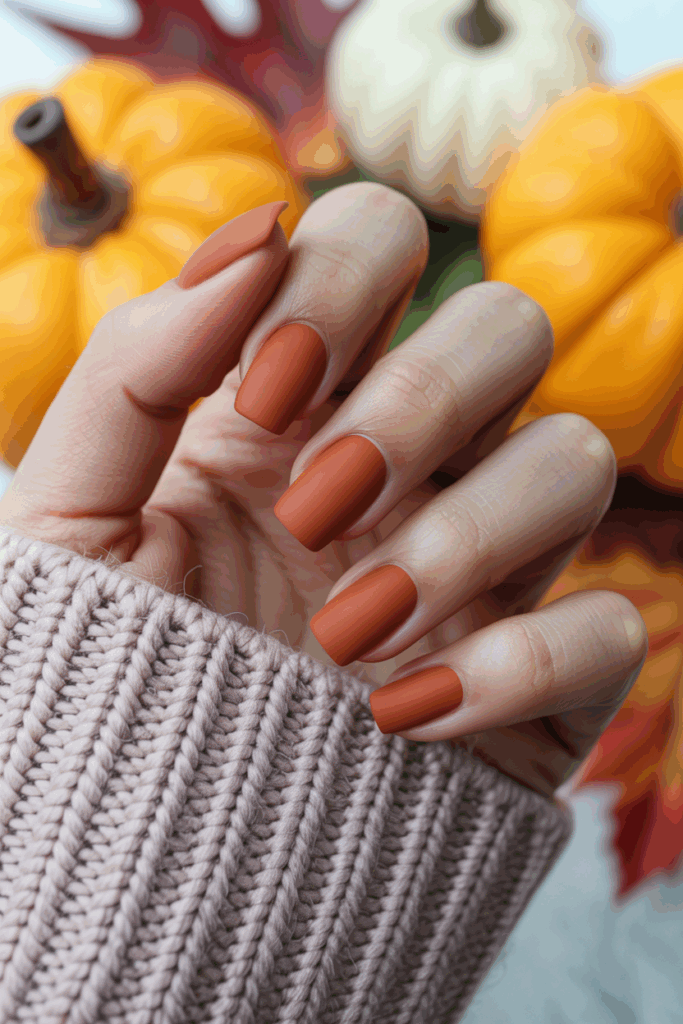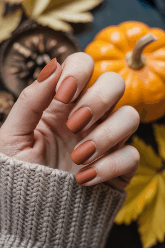 As the leaves turn and the air gets crisp, terracotta nails bring a cozy touch to your fall look. This rich, earthy color perfectly complements the vibrant hues of autumn. In the image, you can see beautifully manicured hands adorned with a warm terracotta shade, effortlessly blending with the seasonal vibe.