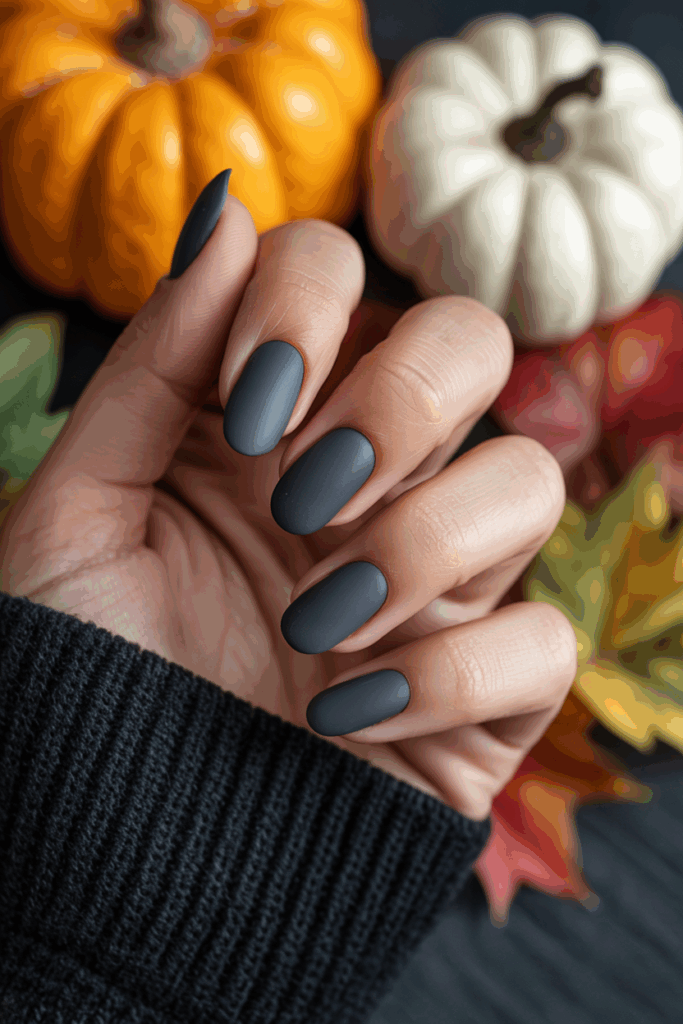 The charcoal gray nails in this image bring a touch of sophistication to any look. This shade is perfect for fall, offering a sleek and modern vibe. The matte finish enhances the elegance, making it a great choice for both casual and formal occasions.