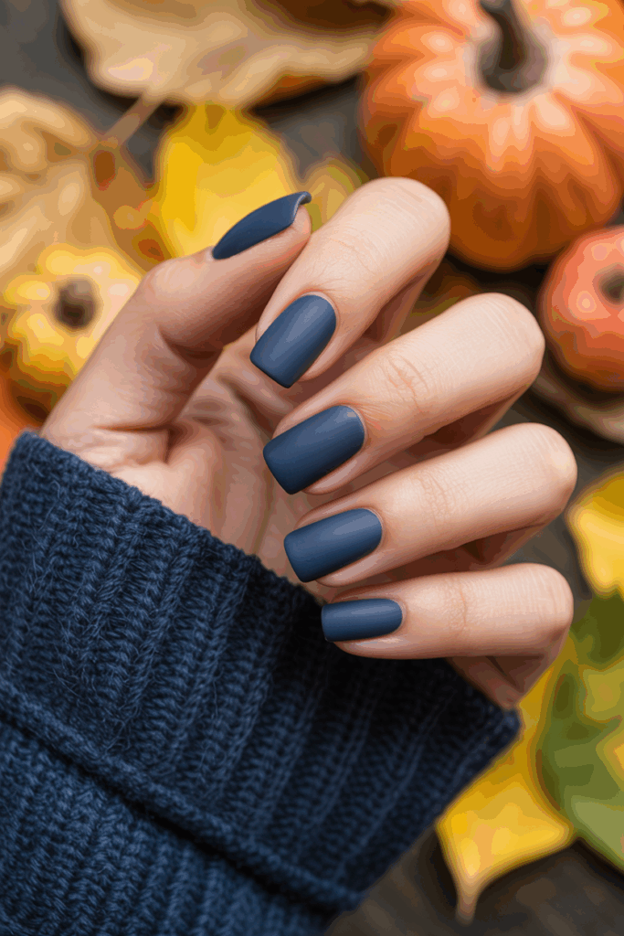 Navy blue nails are a timeless choice, especially in the fall. This deep, rich color brings a touch of sophistication to any look. In the image, you can see beautifully manicured hands showcasing a stunning matte navy blue finish. The matte texture adds a modern twist, making it perfect for the season.