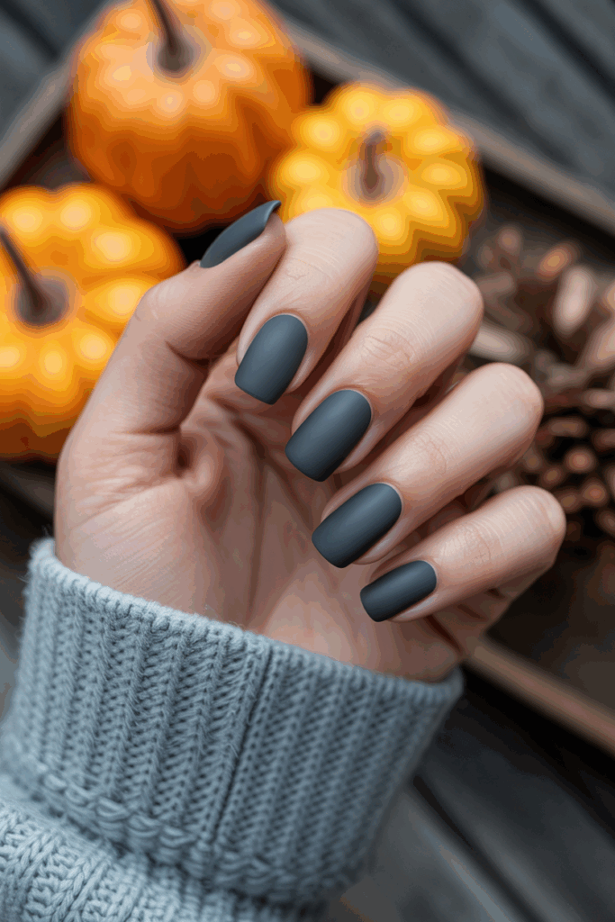 Matte navy blue nails are versatile. They can be dressed up for a night out or kept casual for everyday wear. This color pairs well with various outfits, making it a go-to choice for many. Whether you’re sipping pumpkin spice lattes or enjoying a cozy evening by the fire, these nails will fit right in.